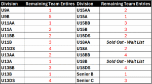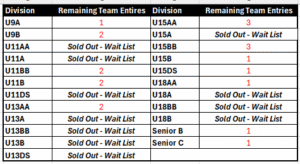 Registration Remains open: However, teams will be notified if they register after a division is sold out. These teams will be placed on a wait list.