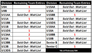 Registration Remains open: However, teams will be notified if they register after a division is sold out. These teams will be placed on a wait list.